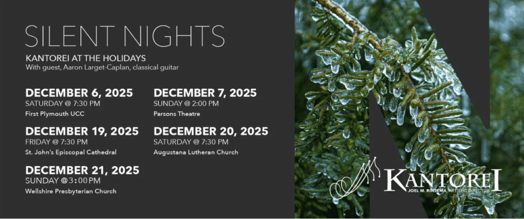 In December, I return to Denver, Colorado, where I grew up, for a series of concerts with the choir Kantorei under the direction of Joel M. Rinsema, titled ‘Silent Nights‘. We will have 5 performances in the Denver area on the first and third weekends. Of special note, is the premiere of ‘Cider Meditation,’ a piece I wrote in March 2025 for Kantorei and commissioned by the Hatala Family. (program below)